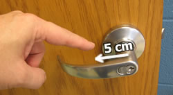 Which equation would I use to solve the following question?A finger is pressing down on a door handle 5.00 cm from the center of where the handle attaches to the door. The door knob rotates from rest with an angular acceleration of 4.18 radians/s
