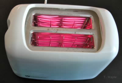 A "toaster" works by heating up some long coiled wires next to a slice of bread. (See the image to the right.) These wires are connected to 120 Volt power source when the toaster is plugged into the wall. Because these wire are energized by the wall you should NEVER stick a knife into the toaster to dislodge a piece of burnt toast. You may accidentally touch a wire and electrocute yourself.