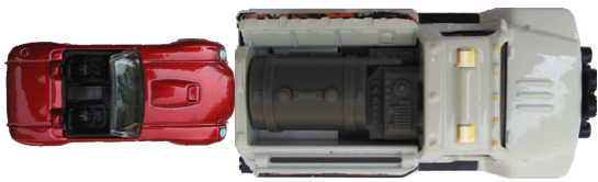 A large truck breaks down out o the road and receives a push into town by a small compact car as shown in the fugure below.