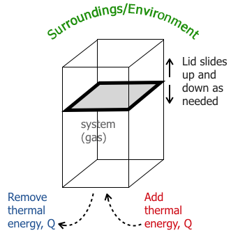 The container houses a monotomic gas. The container does not need to be a rectangular shaped cube. It could be a car, room in a house, hot air ballon, cooler, soap bubble, your lungs, etc. This container is just a simplification of the system. Thermal energy can be added or removed from the container. The lid can slide up and down without friction. This means the gas inside can expand or contract. The space outside of the container is called the, "surroundings," or, "environment."